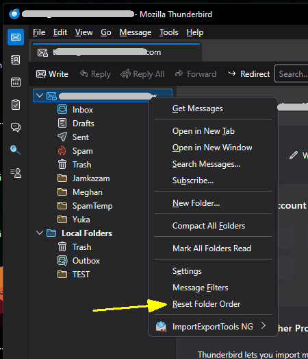 Sorry to report that "Reset Folder Order" did not re-alphabetize the folders. I tried it both with QuickFolders active and inactive. As you say, dragging and dropping is a delicate operation. I'm a klutz with such maneuvers and something that I did caused those folders, which had been a single selected group, to go to the end of the sequence, and I have no idea how to duplicate that. I had successfully made such moves before.