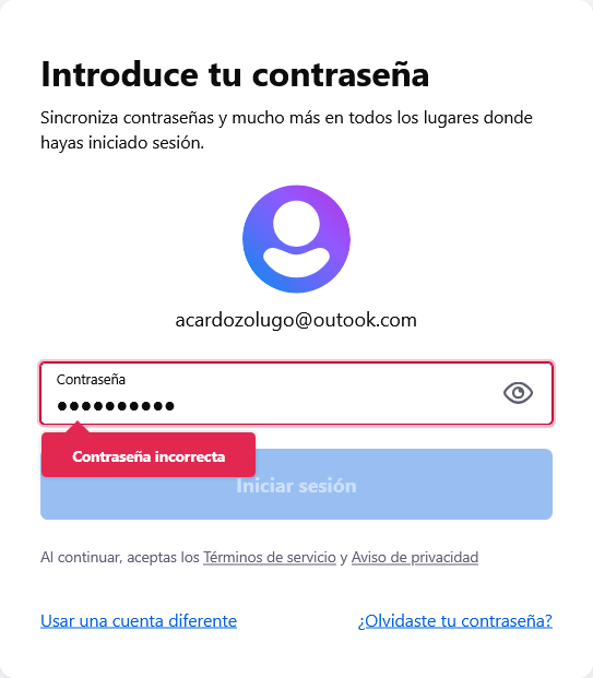 Hola, Puede probar en el Firefox ingresar al sitio de la cuenta de Mozilla https://accounts.firefox.com/ Si la contraseña da incorrecta debe ser incorrecta, tenga en cuenta que la contraseña de la cuenta de Mozilla no tiene que ser la misma que la de su correo (outlook) de la contraseña maestra del Firefox.