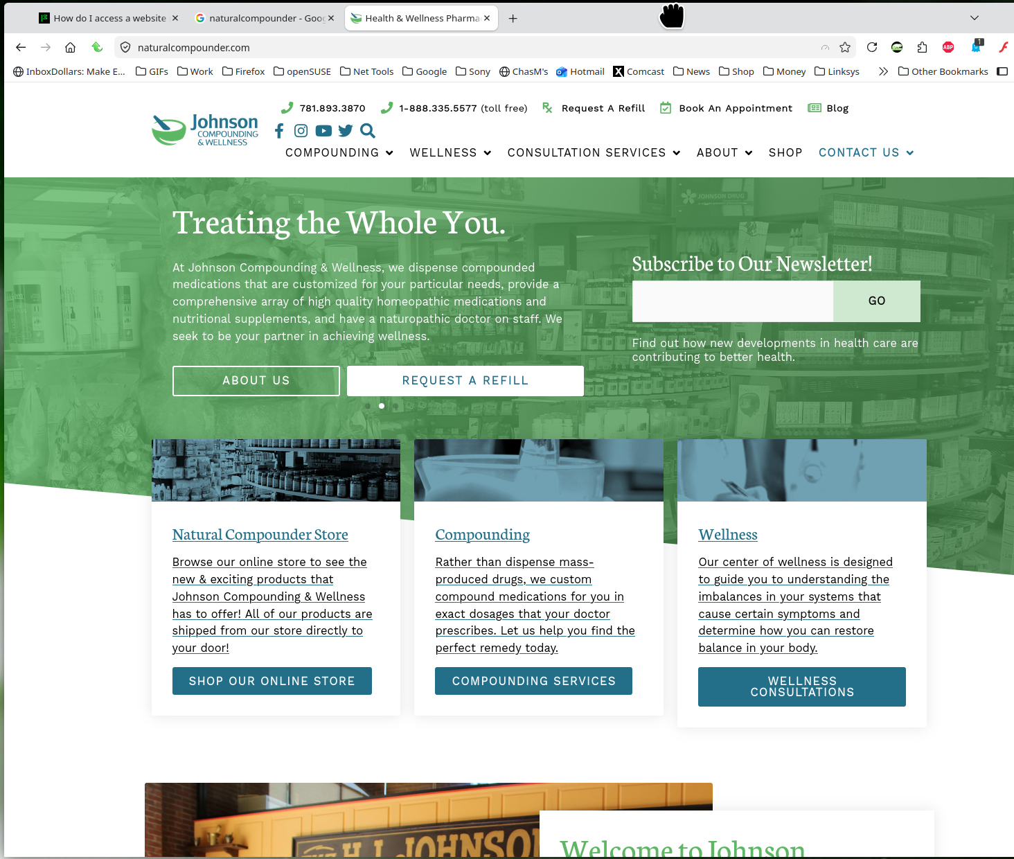 Hi, Jonzn4SUSE, Thank you for your prompt response. No, your suggestion to use the https:// site did not help. That's exactly what I have been using. I can easily access the site but not the "SHOP" tab which is what I have used for years to place my orders. Yes, it IS a nice store! :-) I have emailed the store to ask them for help. It's the weekend so I look forward to their contacting me tomorrow. You comment about Johnson's Compounding having a "an issue with their url" seems right on. Thanks again for taking time to reach out to me. I am grateful. Have a peaceful, bountiful week, Kathryn Hochhauser