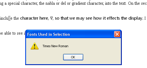 On this site, the support page, the character displays appropriately bu if I highlight it then the highlight extends way above and below that character. It is on a plain vanilla html page that I get the spacing error. This is the test text: <title>Document Title</title> here is a line or two, but actually this nonsense is just being used to generate a lot of test text so that I can see the effect of including a special character, the nabla or del or gradient character, into the text. On the second copy of this paragraph I will include the character here, , so that we may see how it effects the display. I hope that I have enough here to be able to see if there are any real issues.