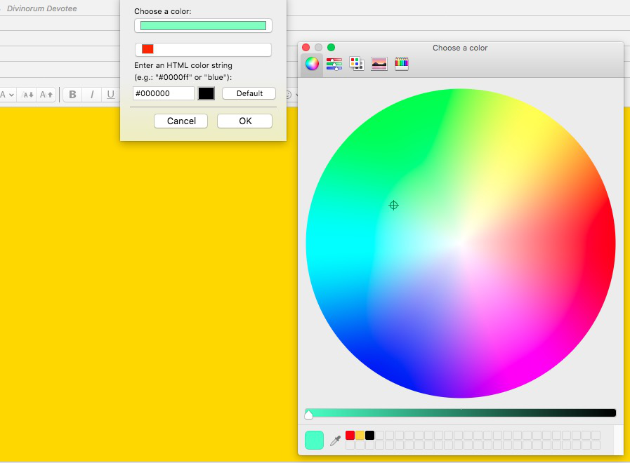 I can't use my mouse click to choose a color, to assign to an attribute like text or backgrounds. If I go into the color requestor, as shown in the pic, and type a color, the change will happen. But I'm limited to some pretty basic colors rather than the whole gamut of colors that I can choose from any of the palettes available.