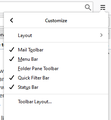View/Toolbars is where all the toolbars are enabled, along with Customize... Press Alt if the Menu Bar with View is hidden. The AppMenu button can be dragged onto or off the Mail Toolbar while the Customize window is open.