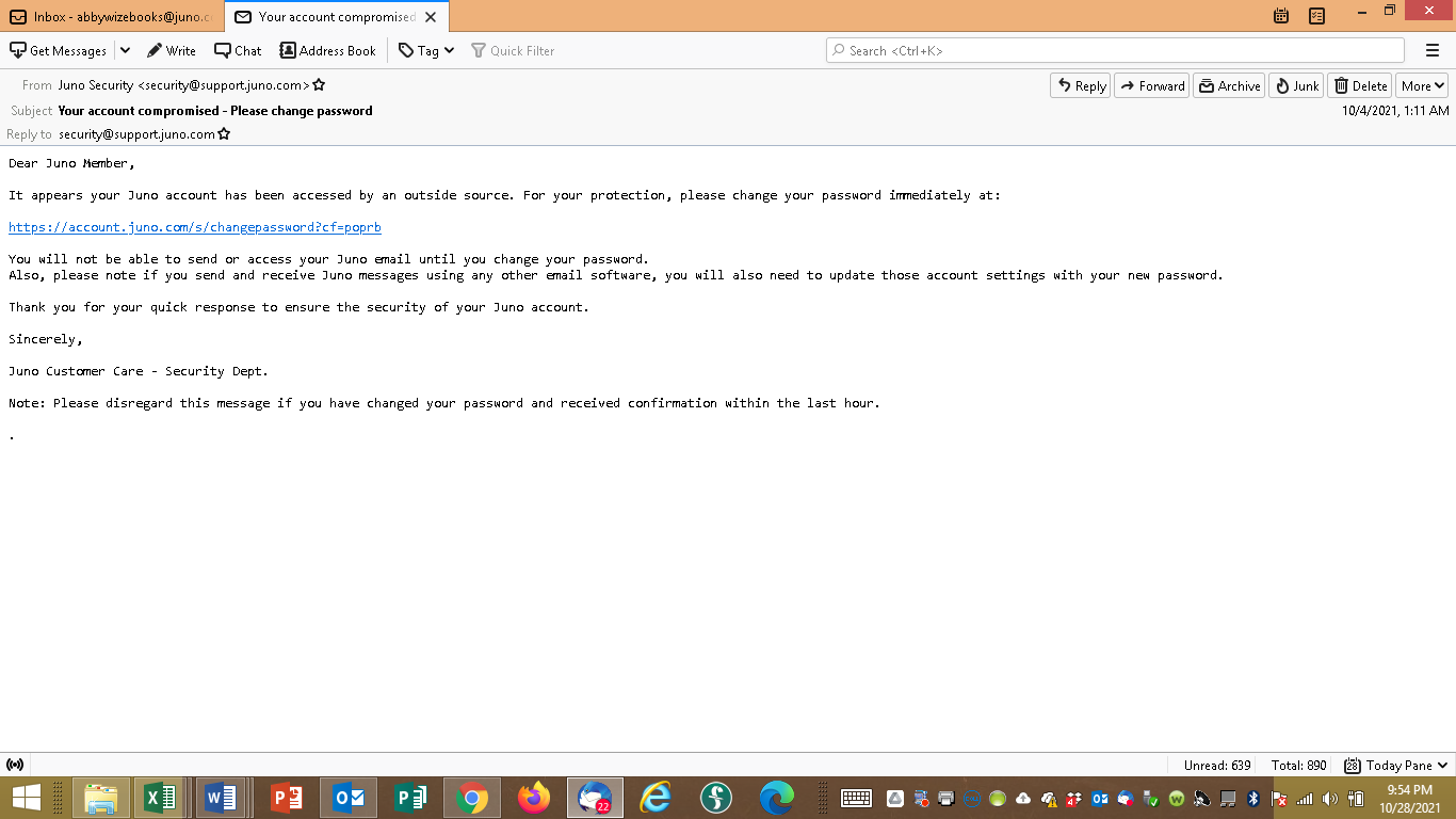 Hi, I have 2 Thunderbird email accounts. One is working fine but the other issued me a warning about a month ago saying my account had been compromised and to change the password, and saying that . It gave me a link but I coulnd't be sure it was legit but it took me about a week to get on my laptop with the right account info and try to change it. Meanwhile my phone was issuing the same warning message every morning (but no other emails) while the laptop stopped recieving any messages at all.