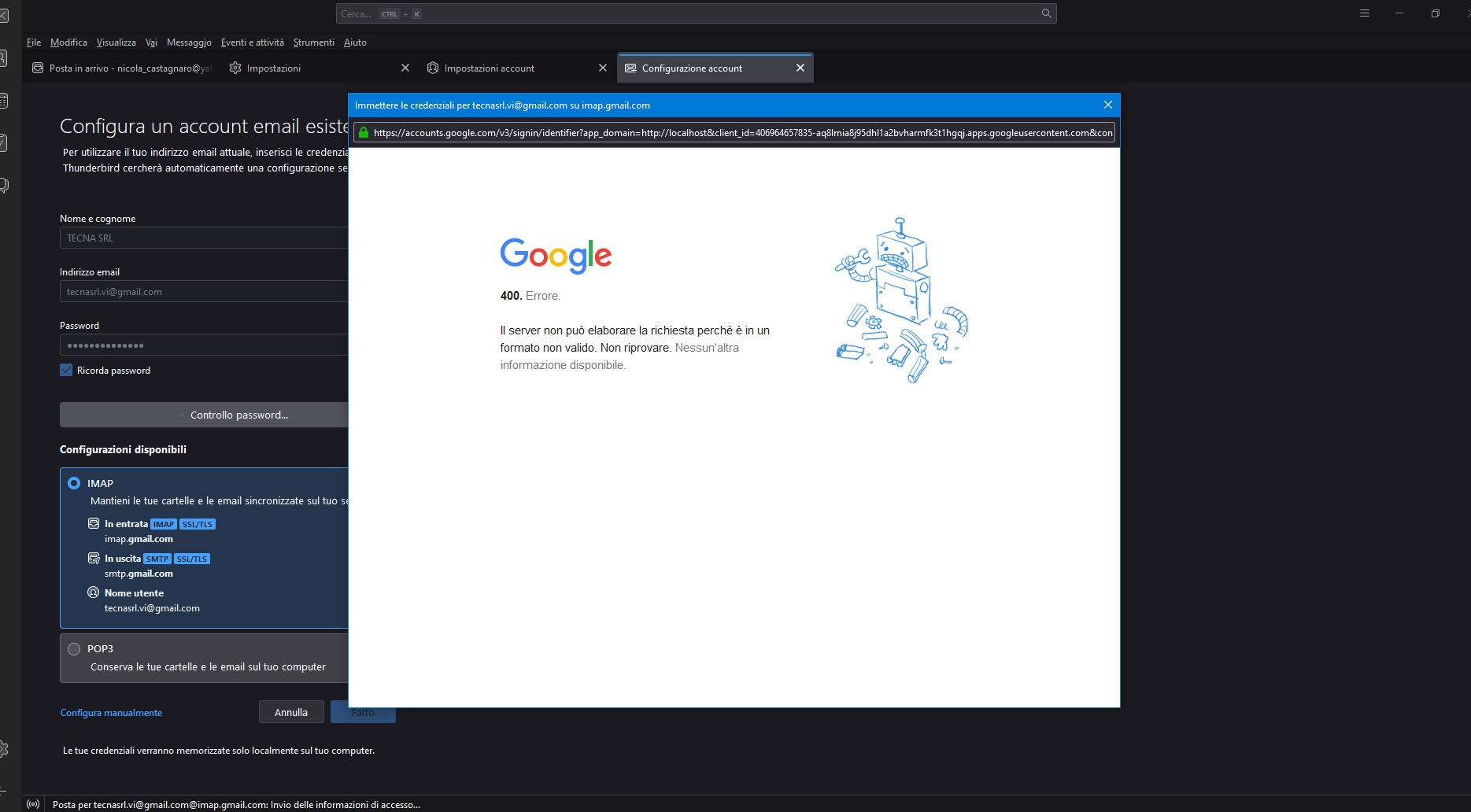 Buongiorno, non è possibile aggiungere l'account tecnasrl.vi@gmail.com a thunderbird in quanto il sistema restituisce l'errore in allegato. Attendo gentile riscontro Ringrazio Saluti Nicola Castagnaro - Tecna Srl