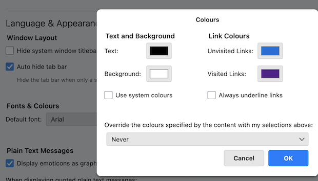 I have been using Thunderbird from the beginning, and before I used Netscape Communicator and Mozilla Suite, always on Macintosh computers. I never activate the dark theme, but to protect my eyes I colour white backgrounds in the main window using CSS codes in my userChrome.css file Here are my settings in General > Fonts & Colours > Colours