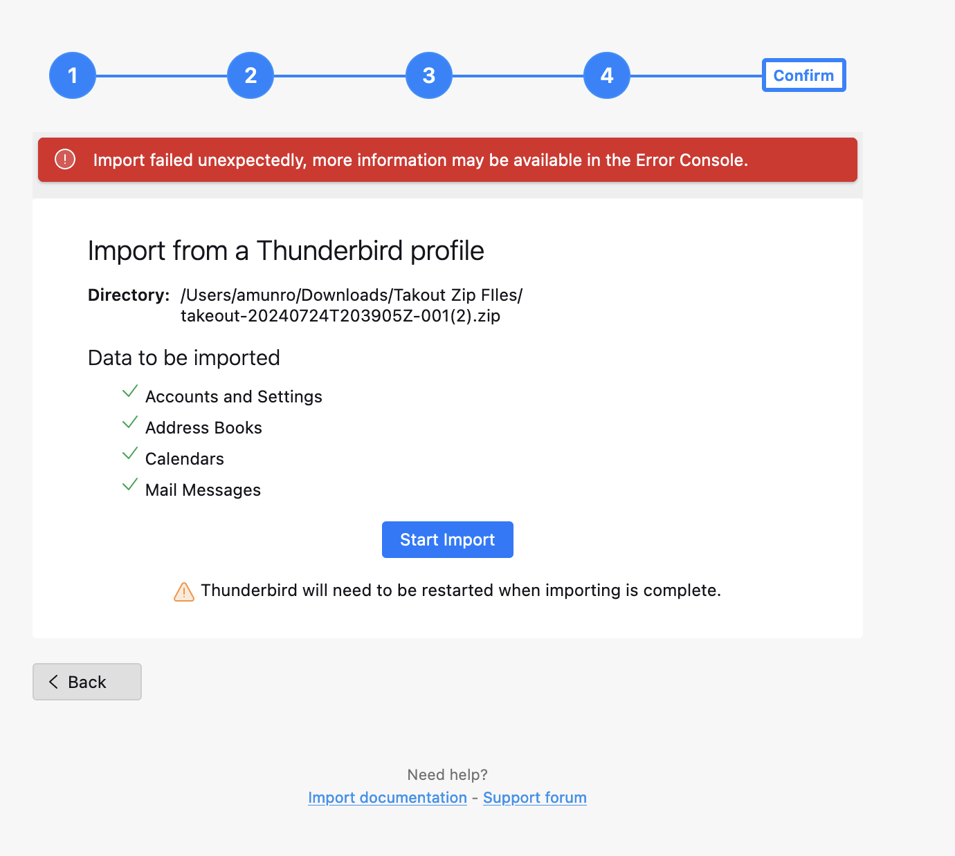 I am trying to import mbox mail files already downloaded from one gmail account into a new gmail account. I am getting this message from Thunderbird: "import failed unexpectedly, more information may be available in the Error Console". I opened the Error Console but cannot understand the gibberish (code!) that shows up! HELP???