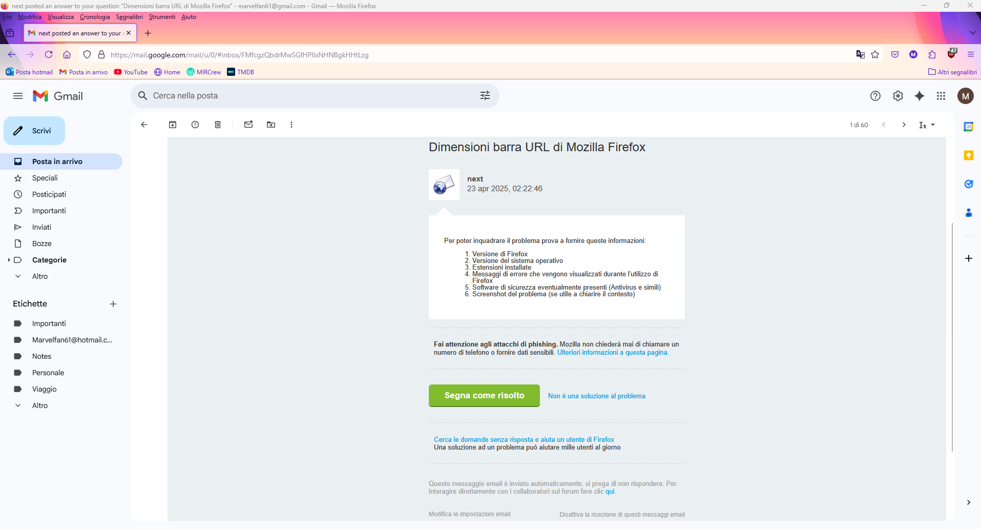 Uso Firefox 137.0.2 64 bit Windows 11 Estensioni installate: uBlock origin, SetupVPN, Cyberghost VPN free proxy, TWP tranlator, Block Site, Hoxx VPN Proxy, Video Download helper, Tampermonkey, Adblock plus, Popup blocker ultimate, Blacklist autoclose Non vengono visualizzati messaggi d'errore Antivirus presente: quello di Windows