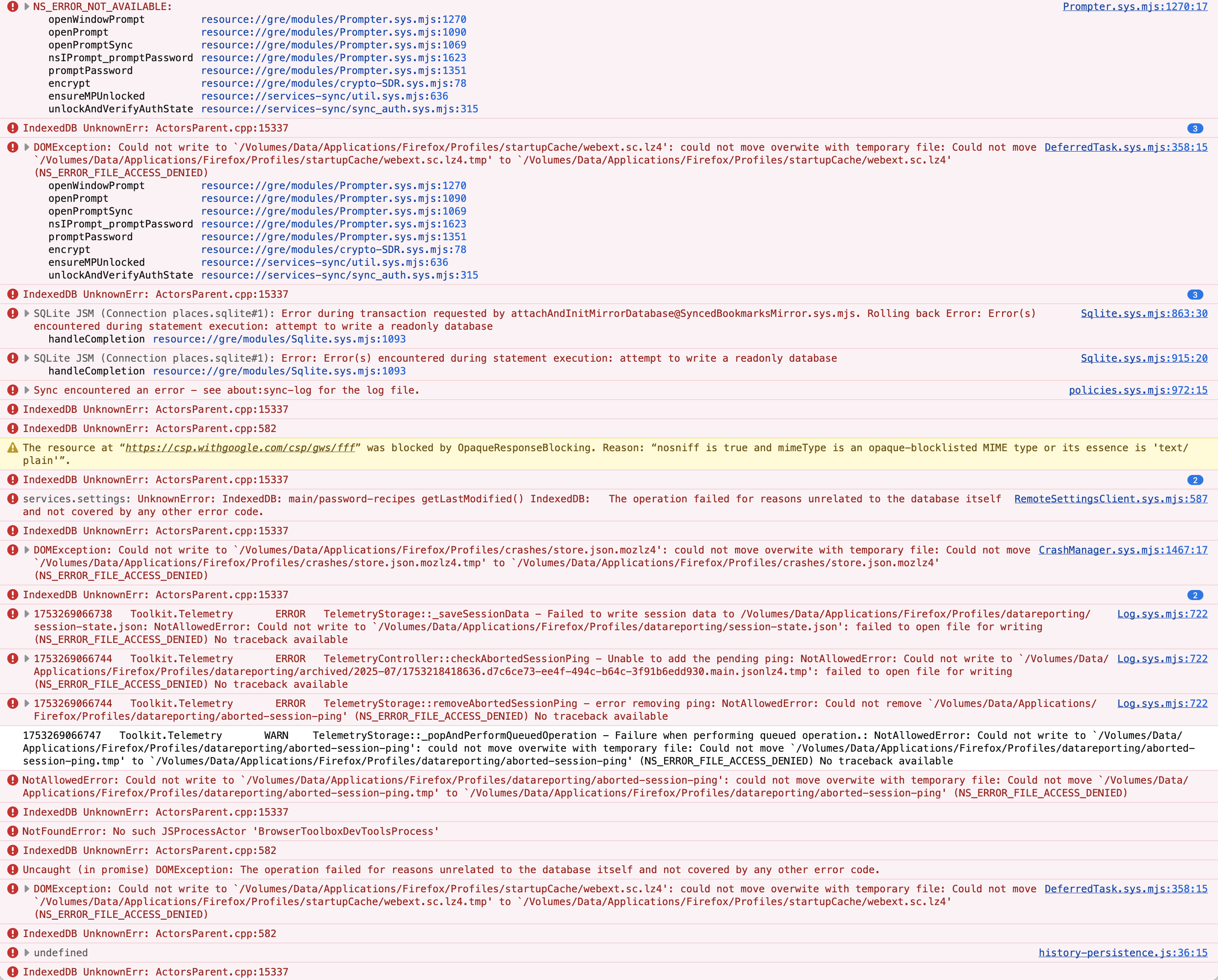 Running Dev Edition 142b1 against the same fresh profile generates the errors attached. NS_ERROR_FILE_ACCESS_DENIED suggests permissions, but I have double checked all those, but given Firefox runs these fine, this looks to be a bug in Dev Edition