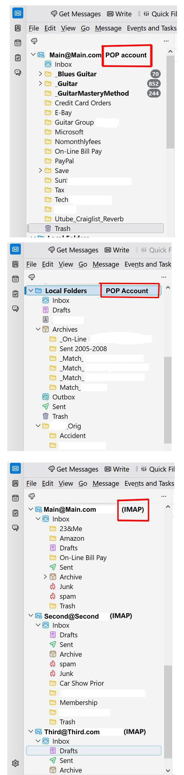 I have 6 email accounts in Thunderbird (TB). 4 recently created IMAP accounts and two POP accounts.