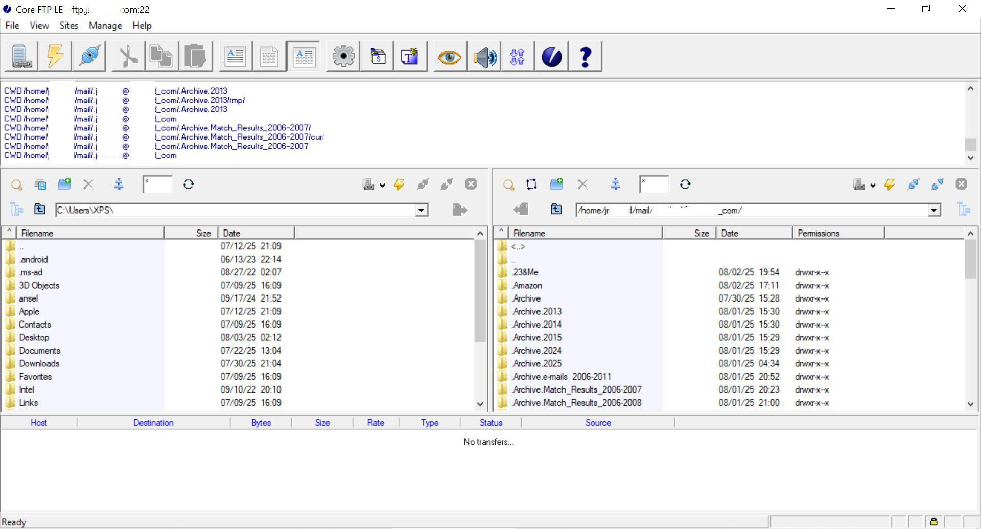 You're probably familiar with FTP programs - the left side file listing are from my computer and the right side file listing are on the provider's website. Listed is the IMAP account that I am working on. I found that exact listing in two locations in a 'Mail' folder.