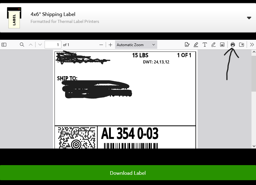 Not sure if posted in the correct group, so I will apolgize in advance if so! I use pirate ship to send out UPS packages. One fills out all of the info, and "buys" the label. Then a Pop Up Box comes up and I hit the print icon and it sends the label, (i think its a PDF) to a 4x6 label printer. I have attached a screenshot, of the pop up that comes up after one buys their label. When I hit the print icon, (the arrow), it has in the past printed without an issue. Now nothing. If I go and open Chrome, got to pirate ship, It will print with no problem a new label, as well as reprint the one that wouldnt print in firefox. Any suggestions? Same desktop, same Win10, latest updates from firefox, same printer.