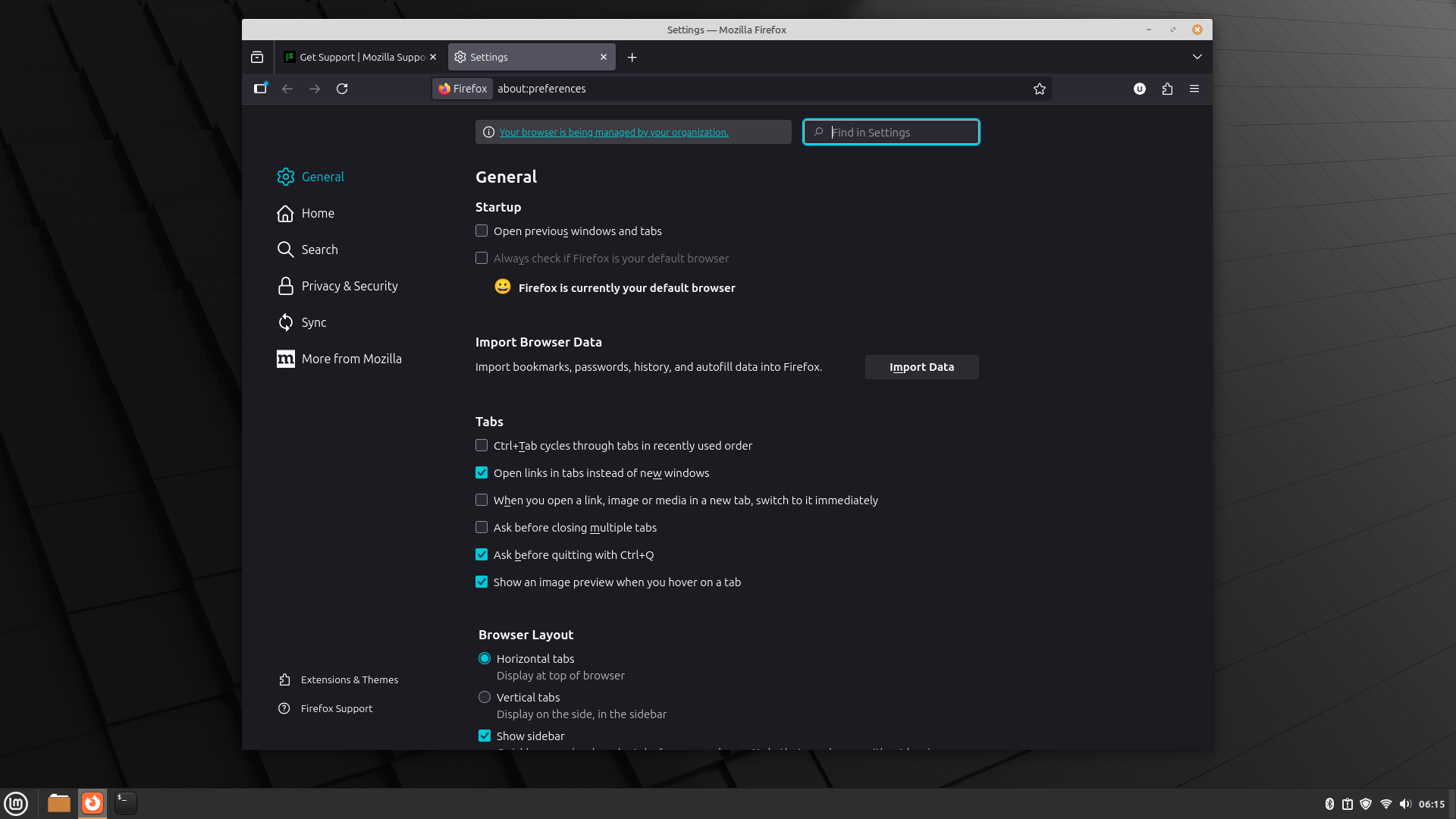 Try downloading Firefox from Mozilla, run firefox-bin from the folder and see if you have the same issue. https://www.mozilla.org/en-US/firefox/all/#product-desktop-release What's showing in about:policies? policy-templates https://mozilla.github.io/policy-templates/