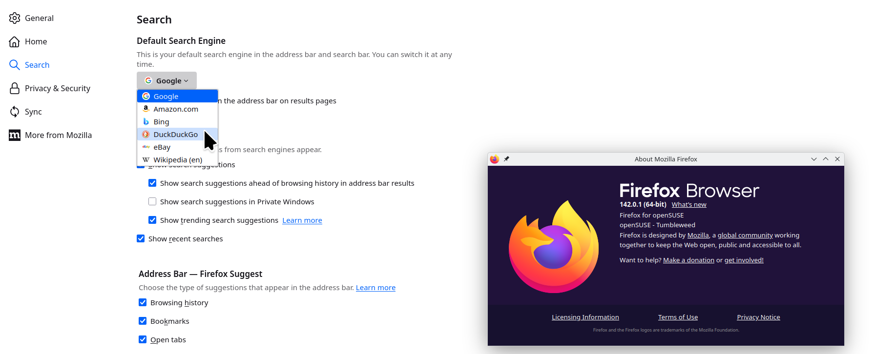 I have the latest Firefox installed on Linux Mint. But in Firefox privacy settings there is no longer a way to choose browsers. It just says "Firefox is currently your default browser". But every time I do a search, it automatically search with Google. That never never happened until I installed latest Firefox. If Firefox is forcing me to use Google, that why do I need Firefox?? Please explain?