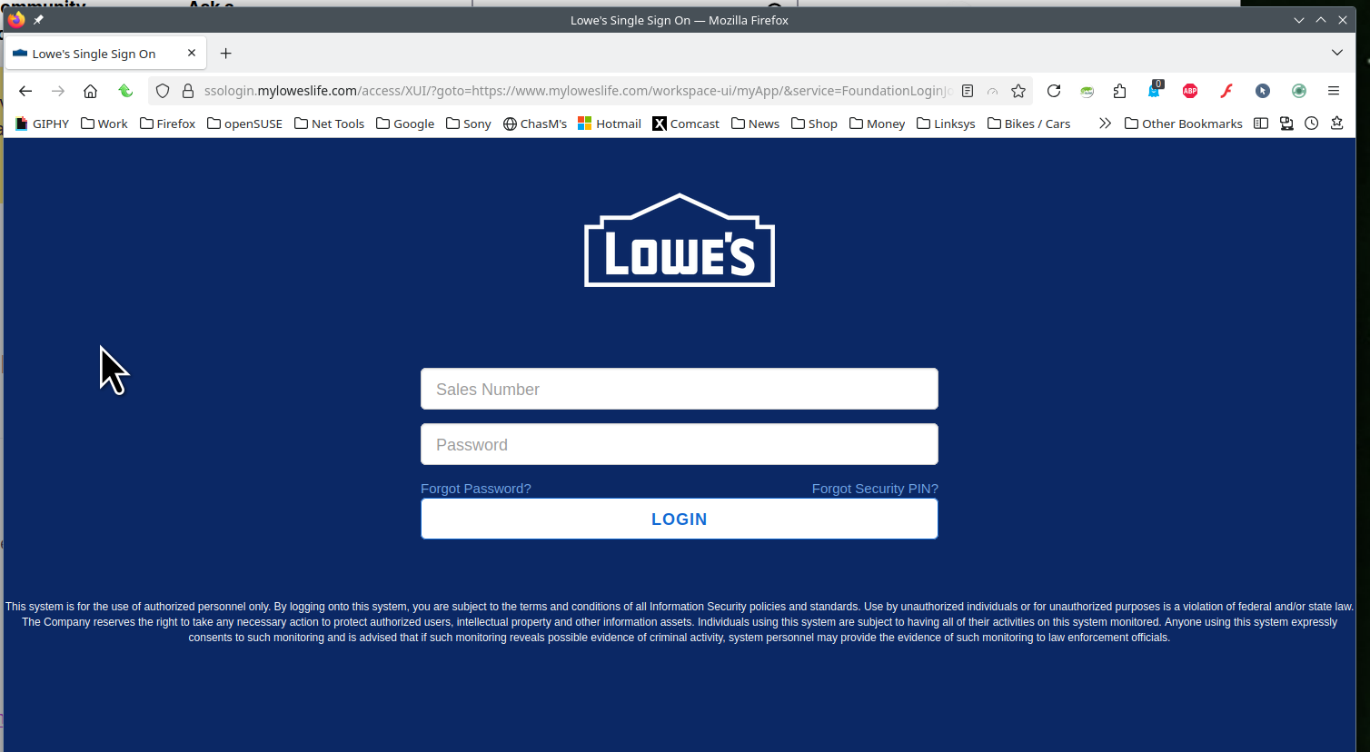 A screenshot is always better. Is this where you're trying to go? see screenshot https://ssologin.myloweslife.com/access/XUI/?goto=https://www.myloweslife.com/workspace-ui/myApp/&service=FoundationLoginJourney&realm=/lowes#login/