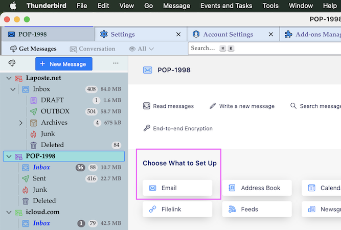 Or got to menu File > New > Email Account... which will open the "Account Setup" in an new tab (second image).