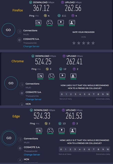 Hello. I've recently upgrade my internet connection (from fiber 200 to fiber 500 now), and I've noticed that firefox is slower than other browser like chrome, brave, edge etc.... The same was happened before so I didn't pay so much attention until the day I made the speedtest. The results was somehow disappointing (made the test multiple times, and days) I've made the test with or without extensions, same problem. I've check also that No Proxy setting is enabled. I've tried the firefox refresh, same results.