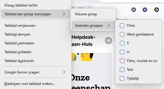 Allereerst fijn dat er een community is om een vraag neer te leggen. Ik ben mij er van bewust dat het werken met tabbladgroepen computer gebonden is en niet gekoppeld aan mijn profiel. Ik krijg mijn gesloten tabbladgroepen met geen mogelijkheid meer geopend. Maar als ik op een tabblad ga staan en vertel dat hij moet worden toegevoegd aan een tabbladgroep dan zie ik de tabbladgroepen wel onder 'gesloten tabbladgroepen'. Zie afbeelding. Dan kan ik er ook één van selecteren en hem daaraan toevoegen en verdwijnt ook gelijk het tabblad omdat hij daar naartoe is verplaatst. Maar ik kan met geen mogelijkheid gesloten tabblad groepen weer opnieuw openen. Ik vind deze situatie ook niet terug in de help artikelen. Wie weet hoe ik dit op moet lossen en mijn gesloten groepen weer zichtbaar (open) kan maken? Alvast bedankt, Marco