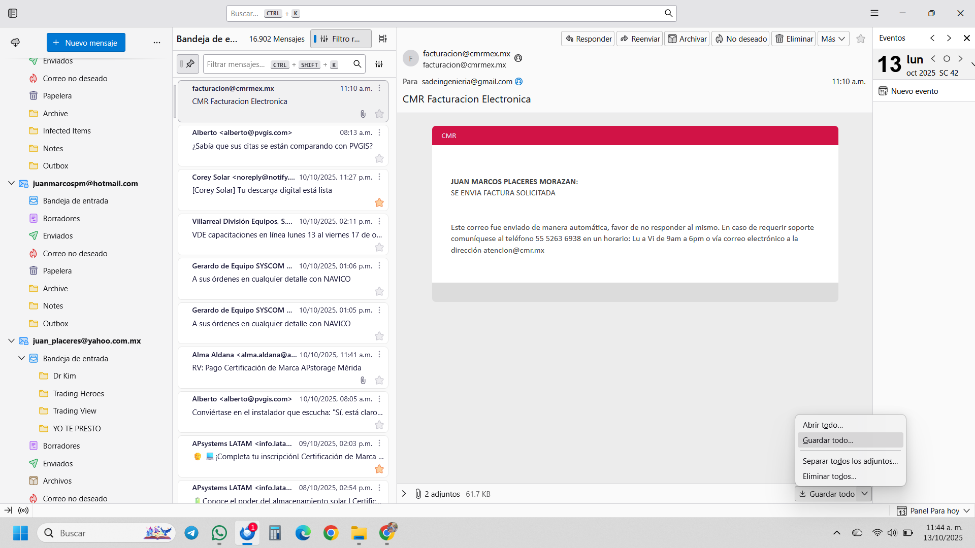 Cuando recibo un correo con archivos adjuntos como en formato PDF, cuando los quiero guardar en una carpeta local y le doy en "Guardar Todo" los archivos no se guardan en la carpeta, tengo que abrirlos en el Software y desde ahí entonces guardarlo en la carpeta. ¿Me pueden ayudar a corregir este problema? antes recién instalado Thunderbird no me daba este problema. Les adjunto una imagen como ejemplo.