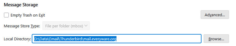 I have multiple email accounts and lots of folders under each. The one I have tried to connect to the old data is pointed at "D:\Data\Email\Thunderbird\mail.everyware.org" in the account settings, and it retrieves my email fine but I can't see any of the existing email.