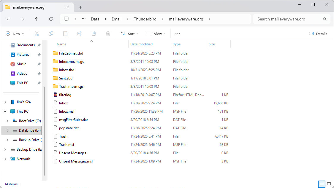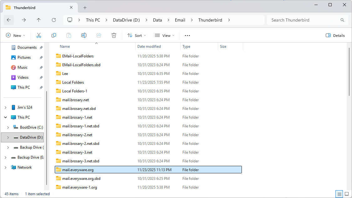 The first shot is the folder where I pointed all the different email accounts to save their data. My main one is mail.everyware.org, and the second shot is of that folder. It looks like the new email is getting saved here, rather than in the subfolders, where the older stuff is. I don't understand that.