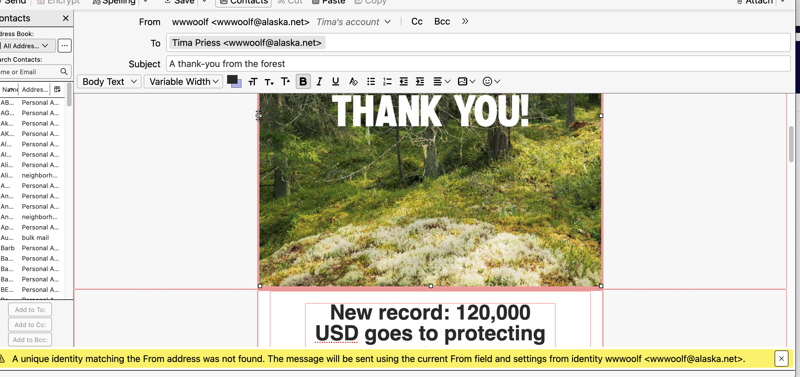 When I click on an email, instead of just showing the email, it sets up a Reply screen showing From me and To Me. At the bottom there is an alert: "A unique identity matching the From address was not found. The message will be sent using the current From field and settings from identity......" (lists my email user name and address). Im not clicking Reply, I'm just double clicking the message to Read it.