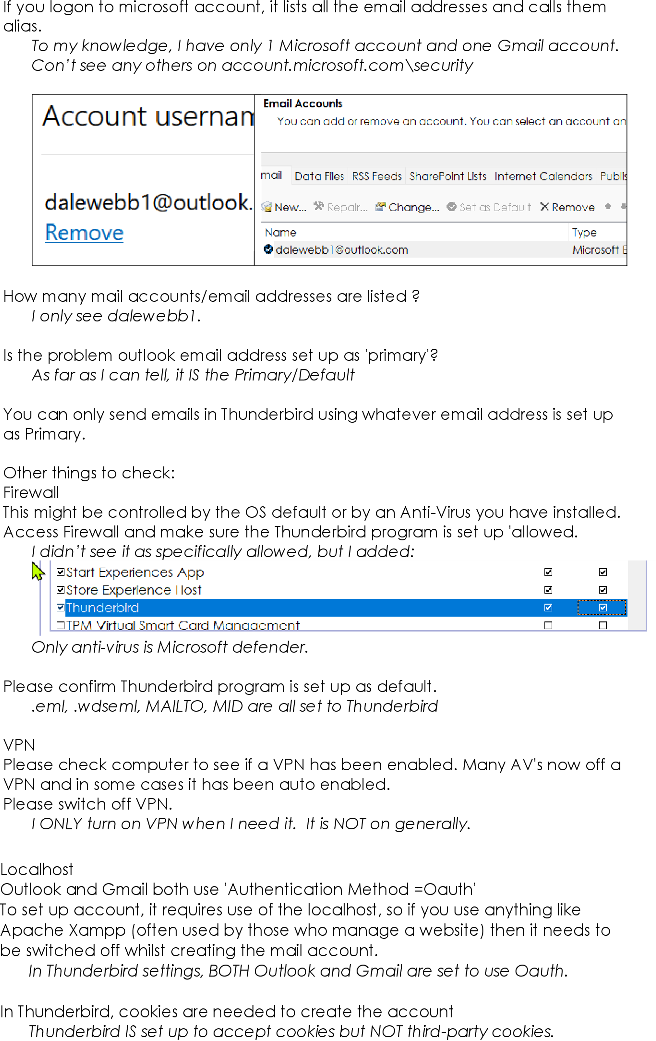 Both accounts have worked for a long time. Probably been using TB for 3 or 4 years. Have struggled to get "real" incoming/outgoing settings for Outlook, especially. Microsoft isn't very consistent. Think I finally have correct information.
