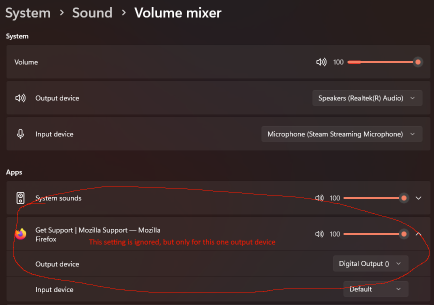 I have two audio outputs I'm trying to use. I want my main output (device A) to stay as the default, but have Firefox play out of the other (device B). There is no option within the browser's settings to change the output device, so I am controlling them through Windows' Volume Mixer. If I set device B as the system default, it works, and it allows me to change Firefox to play from any output. However, if anything else is set as the system default and I set Firefox to play from device B, it doesn't work. It seems like it ignores only specifically that one device, and only when it is set at an app-specific level. It works on all my other outputs no matter which is the default. Even if I have device B as the system default, then at the app-specific level, set FF to any other device, then select device B, it ignores this and continues to play out of whatever device it played from last. The ONLY way I can get Firefox to play audio from device B is with device B as the system default. It's already disappointing that I can't control this directly from FF settings, but the fact that it's also ignoring my OS settings is really frustrating. I've already contacted Windows support, and they say the problem is with Firefox since all my audio devices are working fine. If anyone can tell me a way to just manage this setting properly in Firefox, some way to get Firefox to recognize the device, or some way to allow my windows settings to take priority over whatever FF is trying to do, that would be greatly appreciated. Thanks.