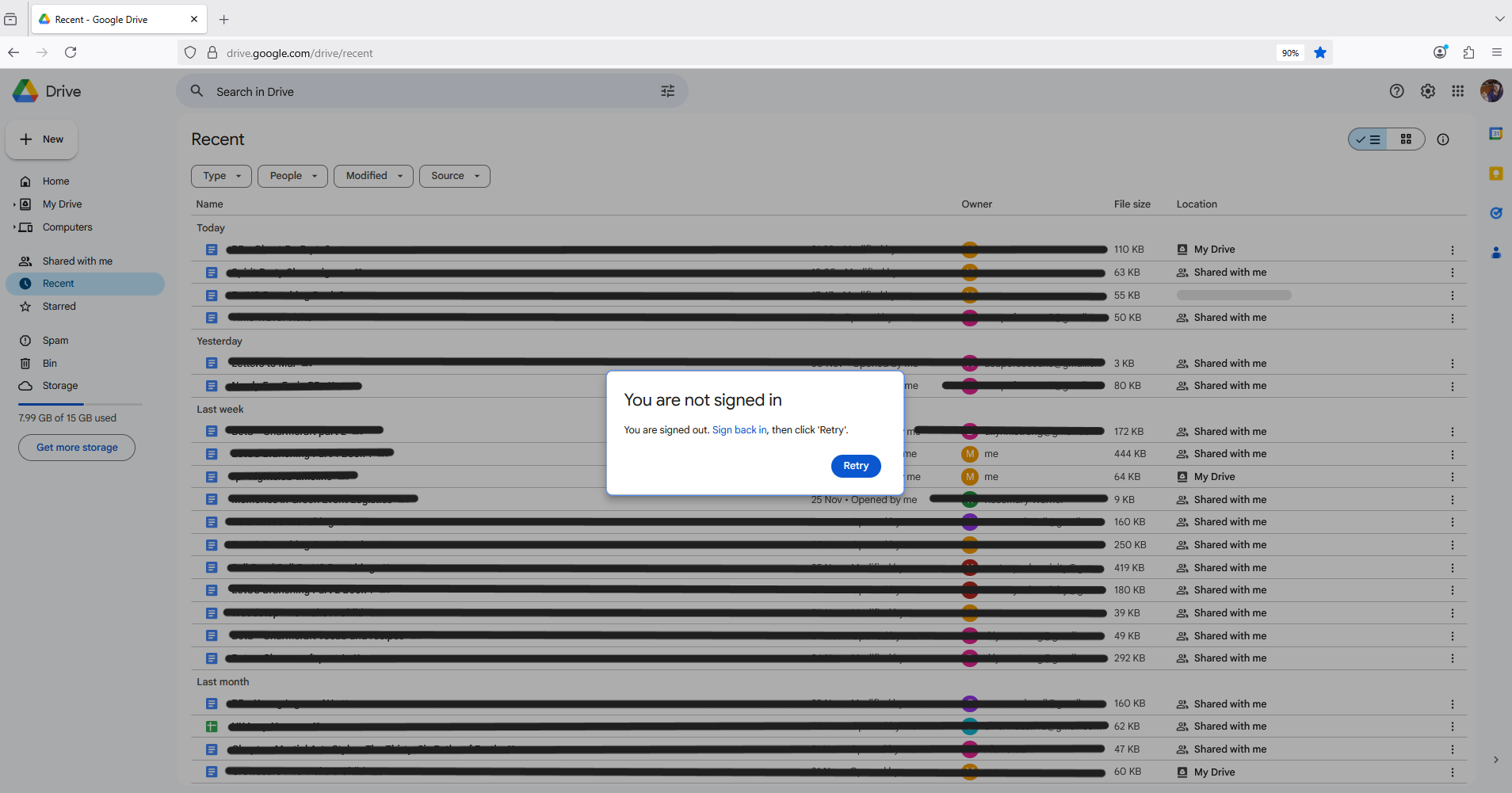 Google Drive is stuck in a loop error saying I am not signed in when my email is signed in