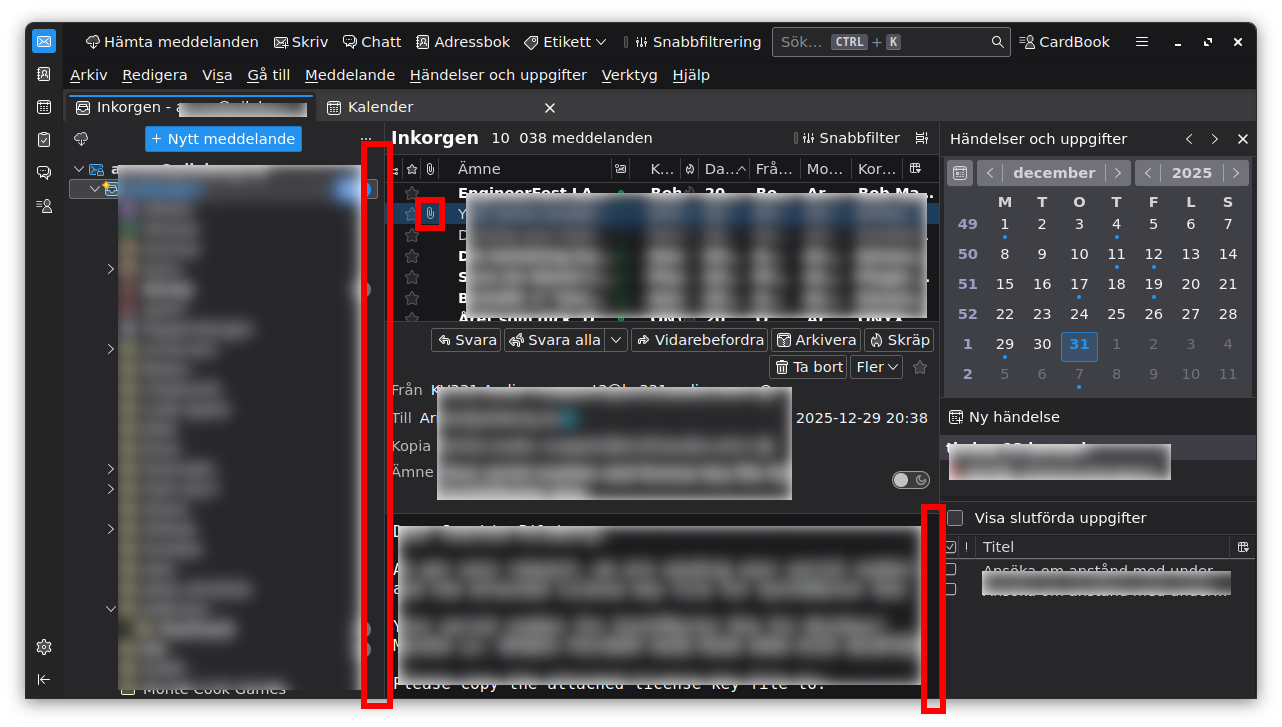 The first problem is that I have a selected mail with an attachment, but nowhere in the mail itself I can see or find or open or download that attachment.