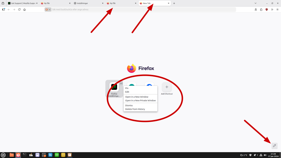 Strangely, New Tab is in Swedish (Ny flik), if I do not use the shortcuts, i.e. chose Empty new page in Settings. How to fix? Minor annoyance, but I would like everything in Swedish, as in v. 146. Is it a bug that will be fixed by Mozilla, or do I have to do anything to fix it myself, or is it un-fixable? Or, is it maybe anything in Linux? I understand it is some changes between 146 and 147 regarding a couple of rather important things. Thanks. >>> System: