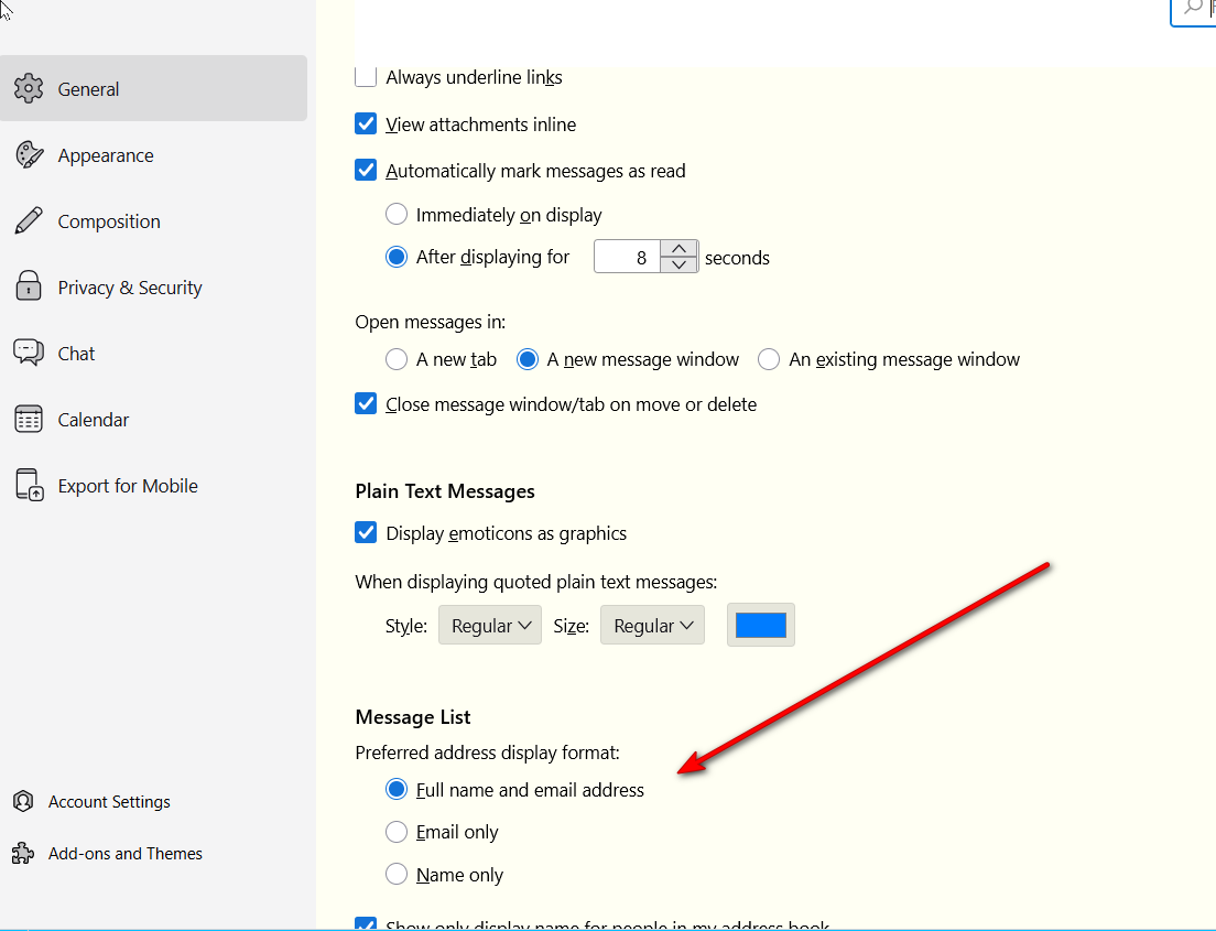 Hi David , I'm following this thread. After settings/general/ i can't find " change the display of addresses to 'email only'." I've Tb 140. 7. 1. with thanks