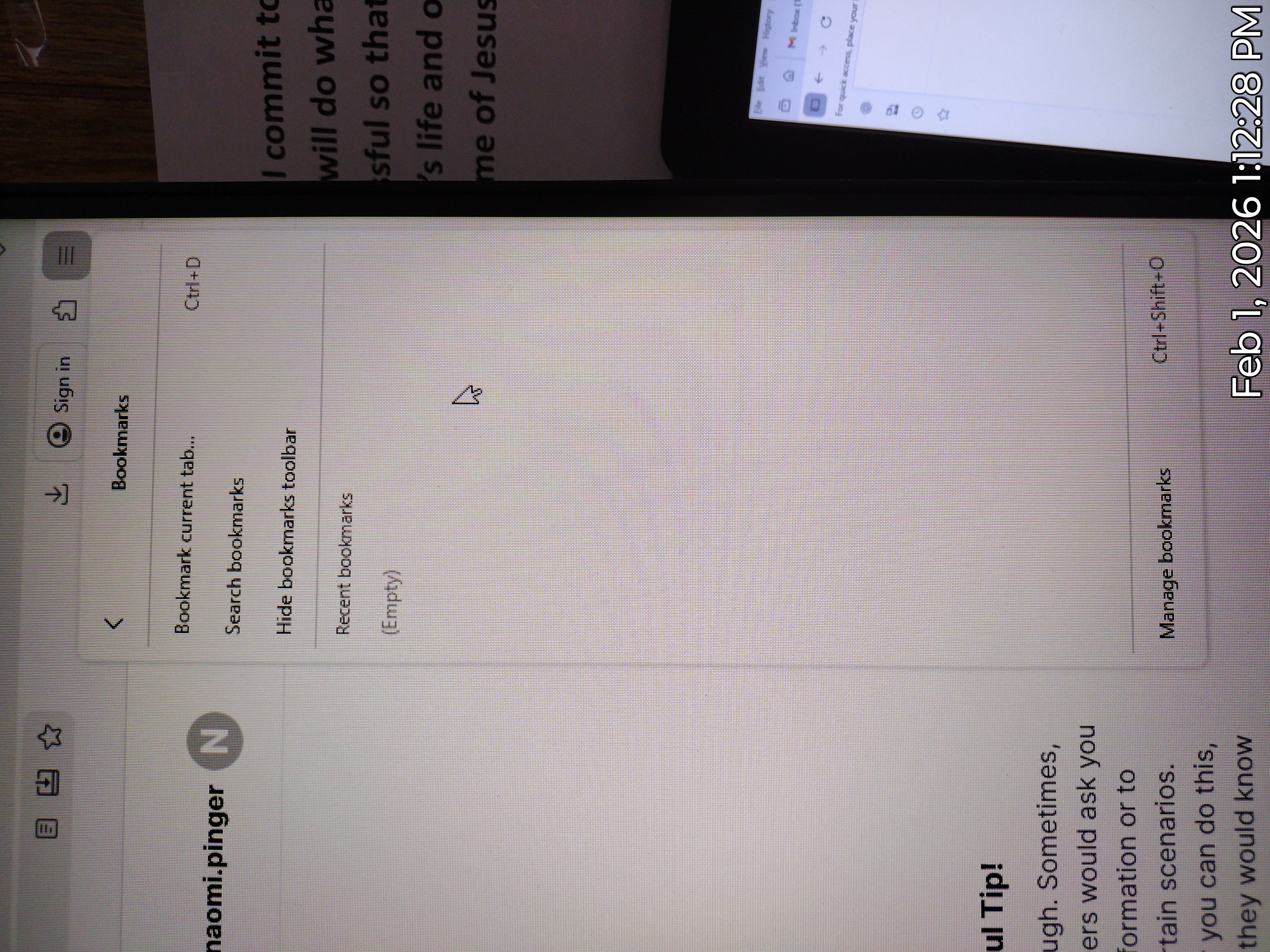 This morning this was at the top of my screen when I logged into my computer. "For quick access, place your bookmarks here on the bookmarks toolbar. Manage bookmarks..."