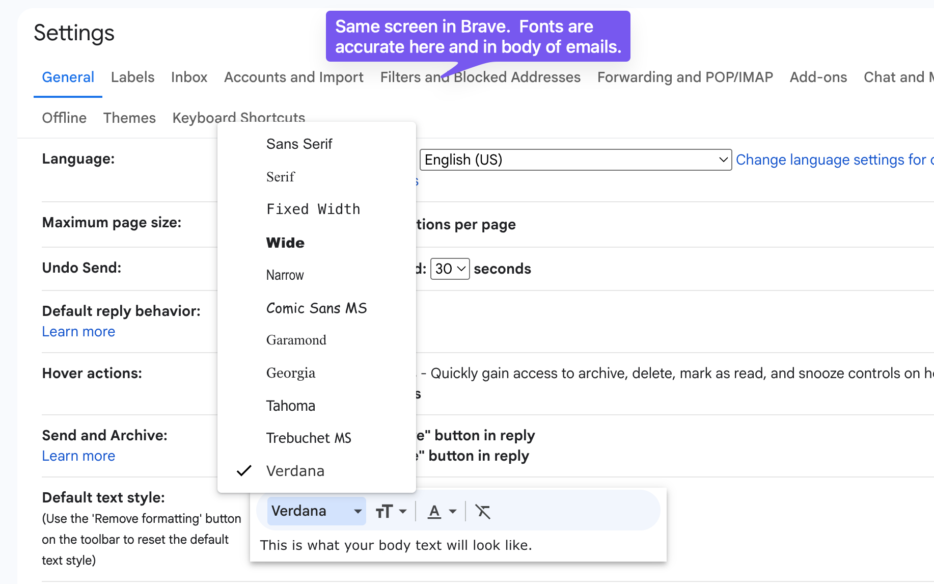 The font options in Google's Gmail are not loading accurately. Please see screen shot below in Firefox vs the same in Brave browser.