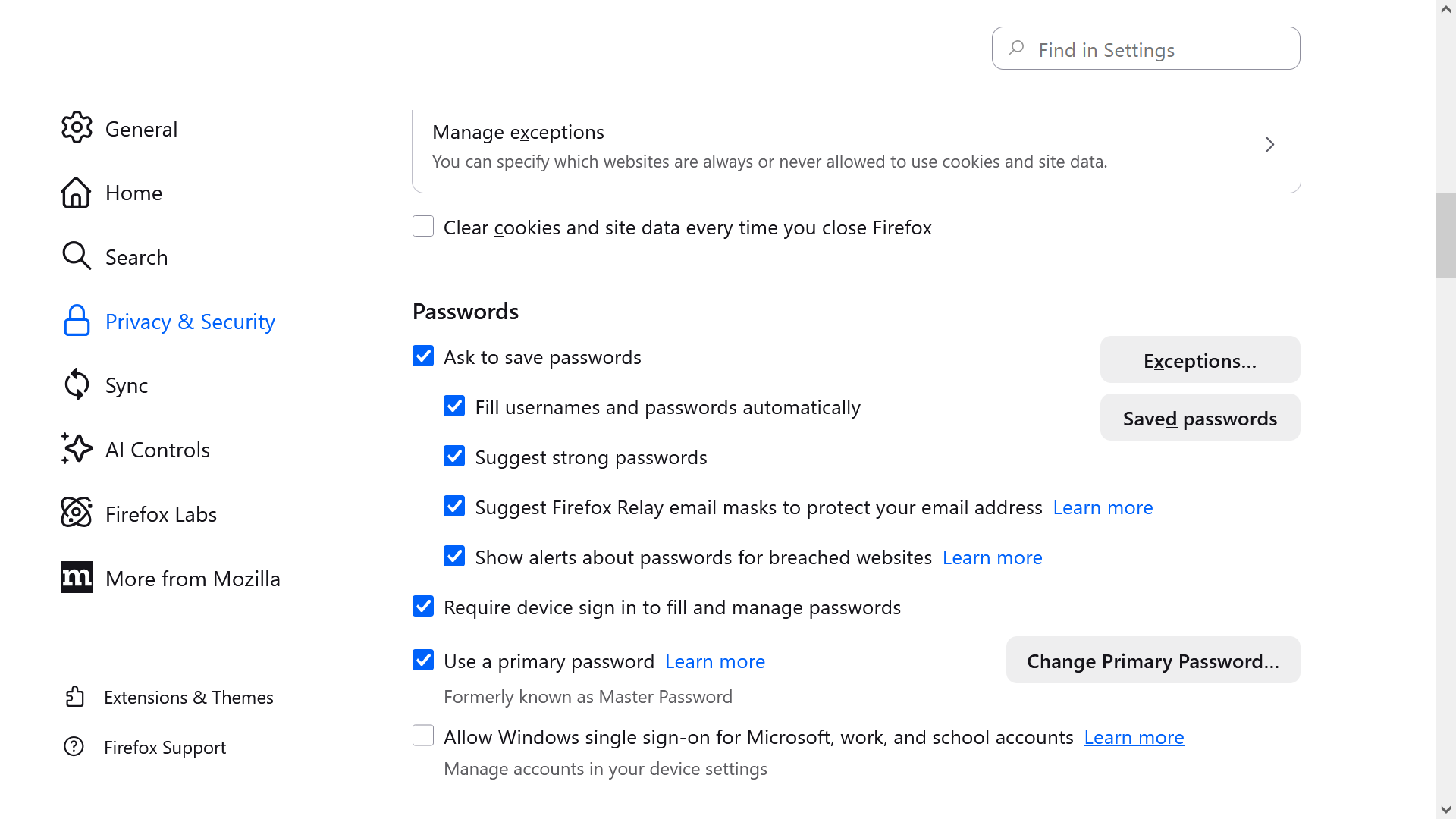 Dear TechHorse, If you read my last, you don't need the screenshot. I have the box checked for the Master Password, now called the Primary Password checked. As always, for many years. And not the box checked for Windows sign in, but Windows is overriding my Foxfire selection. And in Windows I don't see anything to stop this either. I have looked on the internet to see how to stop this linking of Windows sign in with Firefox and other people have this perplexing invasion as well. Thanks anyway.