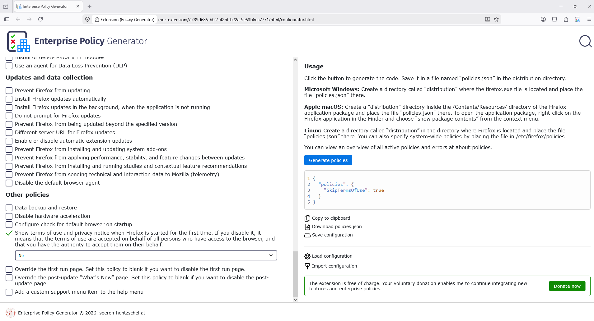 Another way, you can use the Windows registry. HKEY_LOCAL_MACHINE\SOFTWARE\Policies\Mozilla\Firefox Or HKEY_CURRENT_USER\SOFTWARE\Policies\Mozilla\Firefox