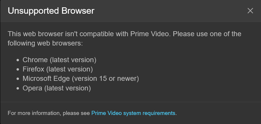 Prime video works in the developer version of firefox, but not normal firefox. I would like to know why and what I can do to make it work in normal firefox again.