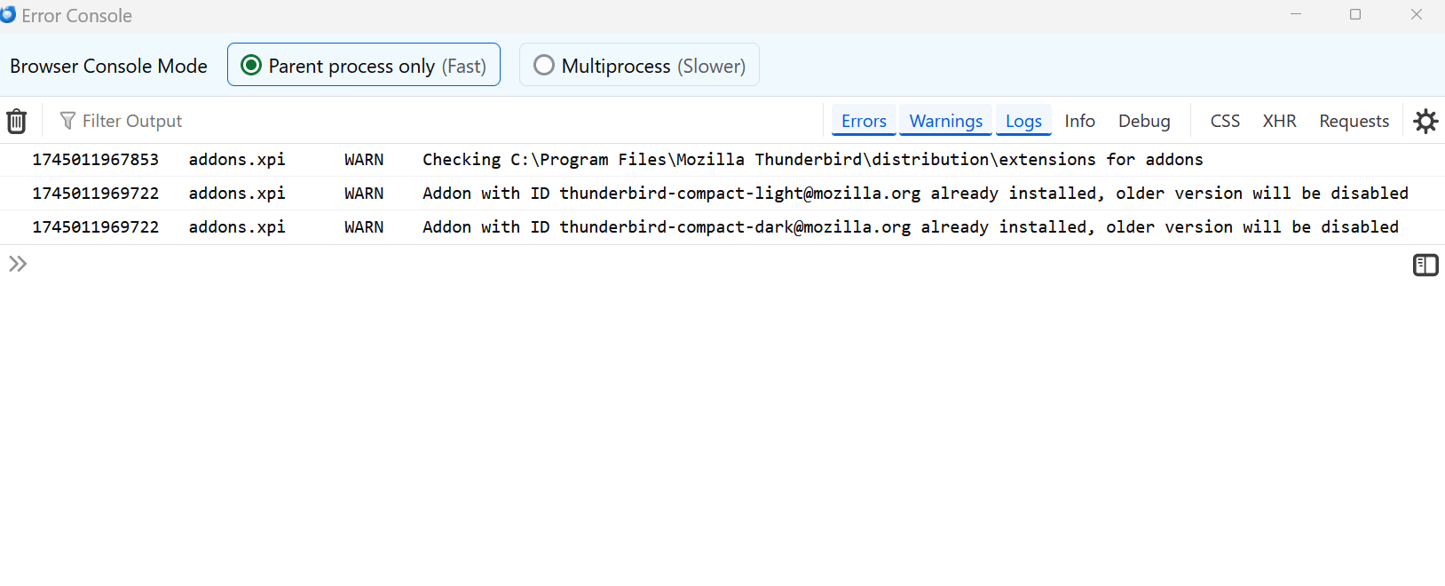 I get this series of 3 error log reports on every Thunderbird startup. I open the ERROR LOG screen and they are there. I can delete them but then on the next startup they are there again.