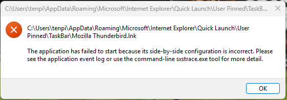 The attached image shows the error message I get when I try to run Thunderbird. This has been the case for several months, and all of the suggestions I've found online have failed to make any difference at all.
