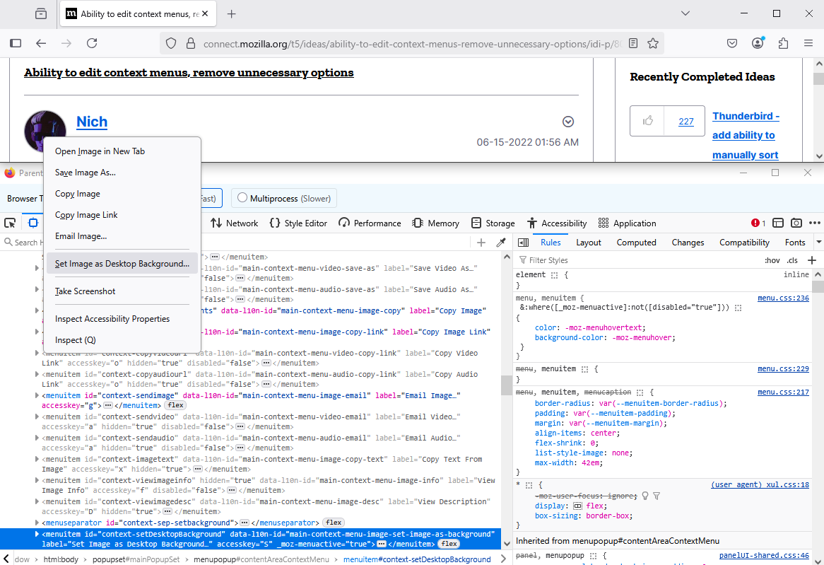 I have searched settings for context, background, and image, and I have searched about:config for desktop, background, context, etc.