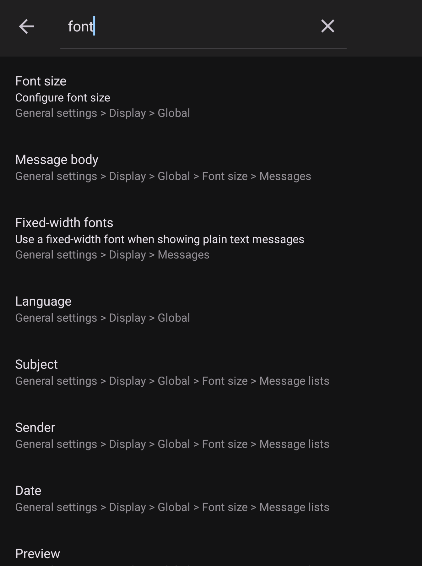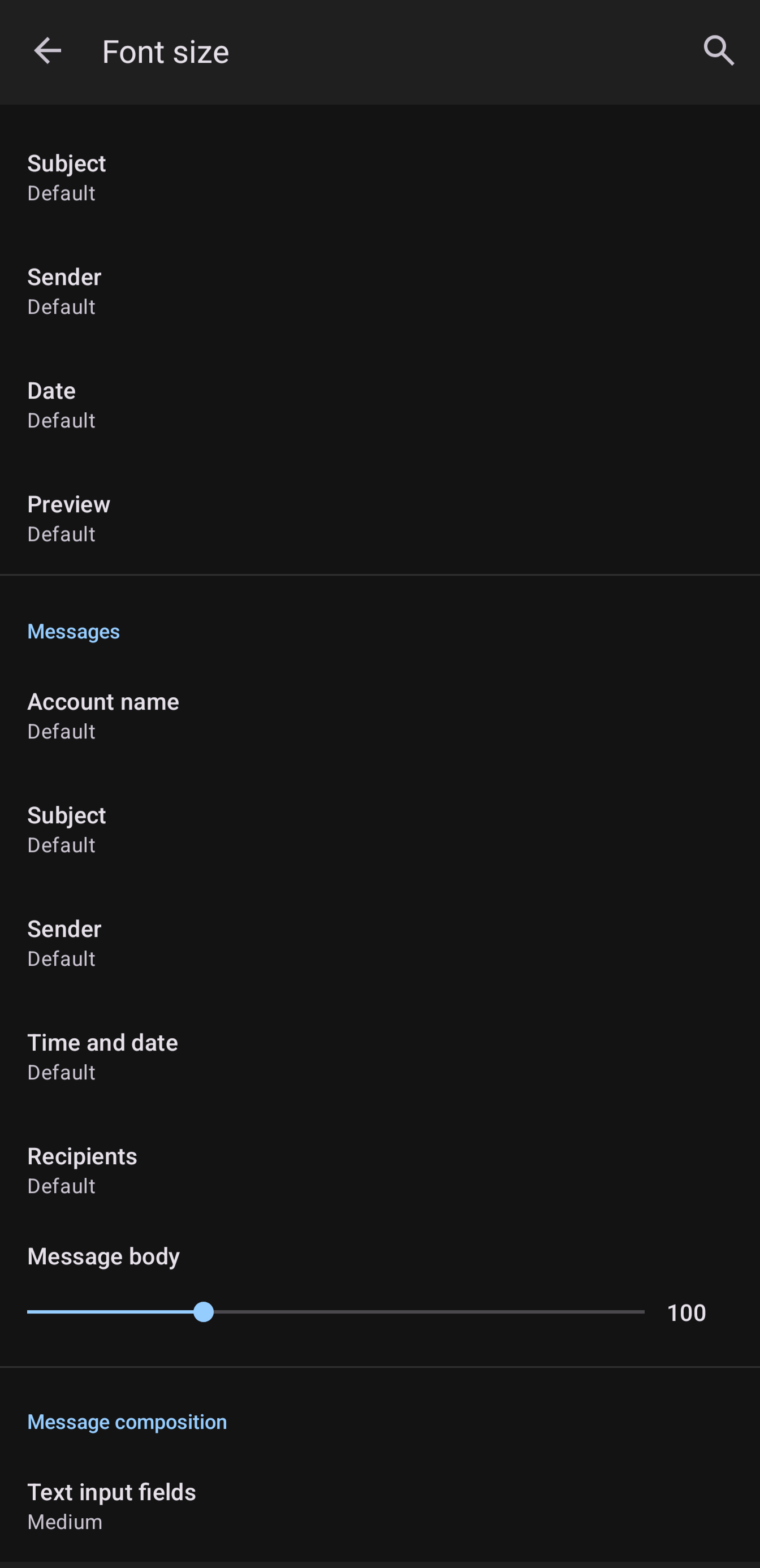 Font settings should not be there at all. Thunderbird for Android should be using the device's font settings.