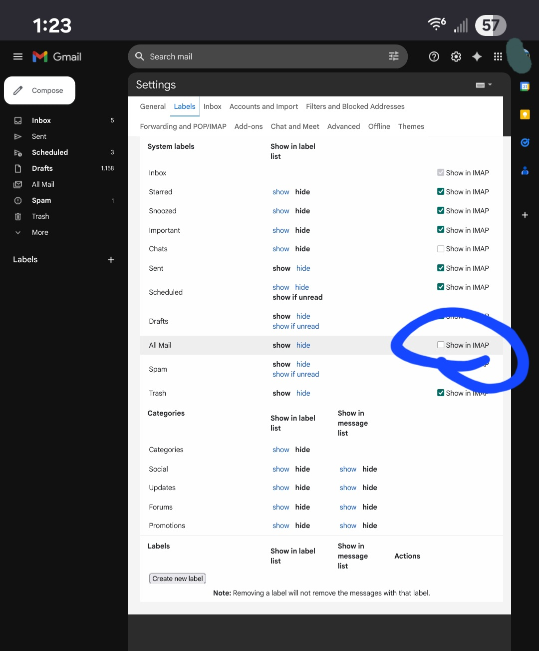 - For 'All Mail' - uncheck the option to 'show in Imap'