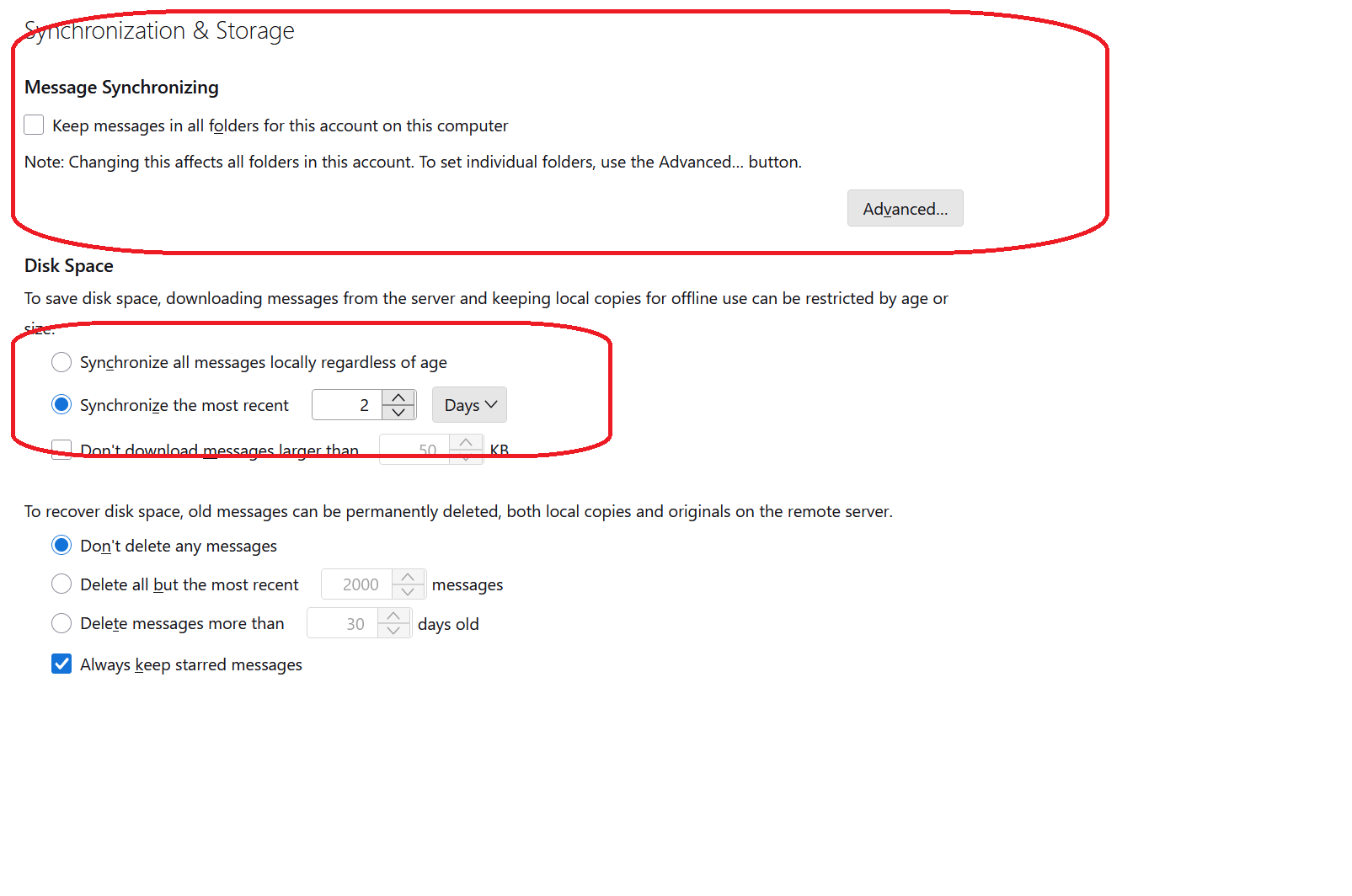 If you then changed the sync period to 2 days: That option would not apply IF you have not manually selected any folders in the 'Advanced' section. It does say...to save disk space, downloading messages from the server AND keeping local copies for offline use (that means fully downloading emails) can be restricted. You do need to have selected to download full copies in the first place in order to place a restriction on what is downloaded as full copy and what is only downloaded as header.