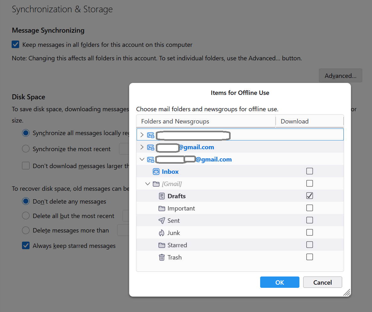 3) If you uncheck the 'keep messages in all folder.....' then click on 'Advanced' button All the folders and subfolders should not be selected and that means for all folders only download headers. None of my folders are checked except drafts, so this is correct or ? See screenshot attached