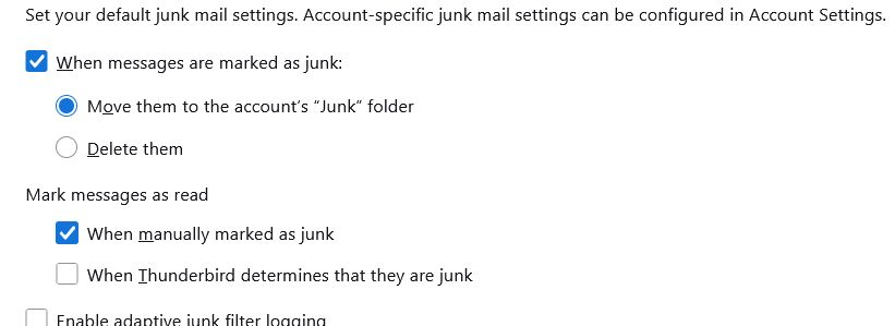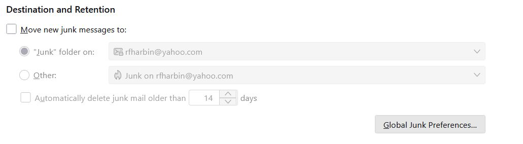 Thunderbird 19Sept 143.0 64bit Windows 11-64 I Have been searching the Support files here for a couple weeks now only to get frustrated and fog up my brain. I have two Junk folders; the folder where the spam goes to is in the Trash folder. The Junk folder in my Yahoo account is not used and I cannot find out how to rid of it. Also I would like to put the real junk folder out of the trash folder and back where it belongs. My yahoo mail account is working OK rfharb imap://in%40yahoo.com@imap.mail.yahoo.com/Junk imap://in%40yahoo.com@imap.mail.yahoo.com/Trash/Spam