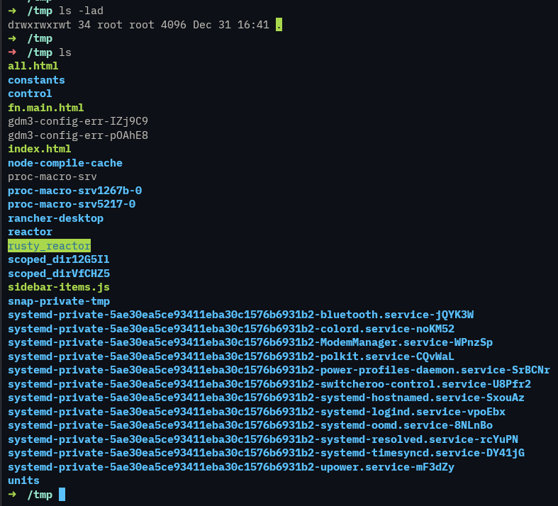 ➜ / ls -lad rusty_reactor drwxrwxrwx 6 ben ben 144 Dec 31 16:40 rusty_reactor
