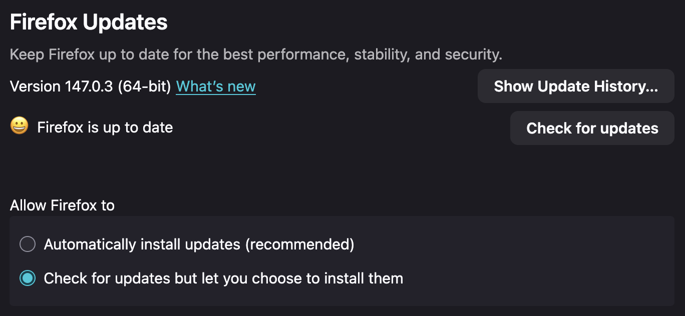 However I have just tried this and I'm still getting the new tabs with the forced need to update. It means in the moment I have to go to use another browser - I think this is crazy - I should be able to choose when I update -by all means inform me like chromium browsers do but don't force me.