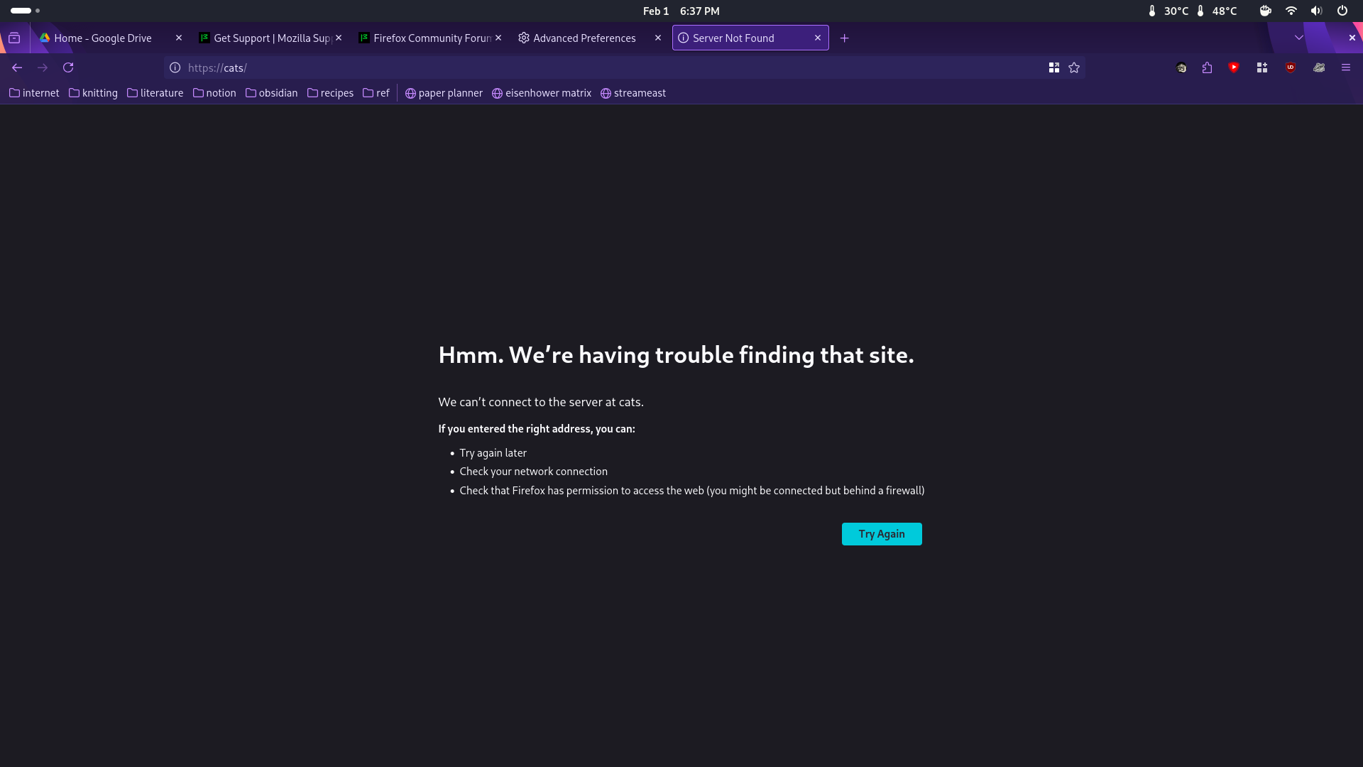 Hi! I recently had to reinstall Firefox. Logged into the same Mozilla account I've been using for several years, with pretty much the same config files I've been using since I switched to Linux, and suddenly--for the first time in at least a year--Firefox has (again) started trying to "fix" searches I put into the address bar that aren't prefaced with a search engine. How do I turn this off? (For example, if I go to the address bar and type in "cats" I get directed to a page like the first attached screenshot. If I type in "@google cats" I get directed to the second attached screenshot...)