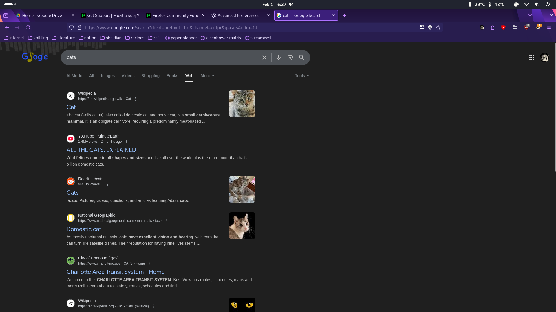 Hi! I recently had to reinstall Firefox. Logged into the same Mozilla account I've been using for several years, with pretty much the same config files I've been using since I switched to Linux, and suddenly--for the first time in at least a year--Firefox has (again) started trying to "fix" searches I put into the address bar that aren't prefaced with a search engine. How do I turn this off? (For example, if I go to the address bar and type in "cats" I get directed to a page like the first attached screenshot. If I type in "@google cats" I get directed to the second attached screenshot...) I'm pretty sure I've disabled everything in prefs.js that relates to that. Um. Feature? But clearly I haven't been able to disable it yet! So.