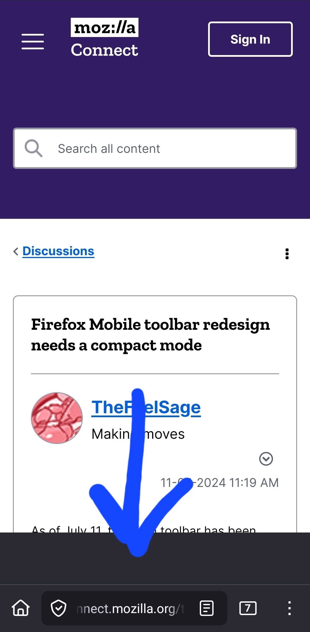 When using Firefox mobile for android, a black bar appears at the bottom of the screen, above the address bar. Please see attached picture.