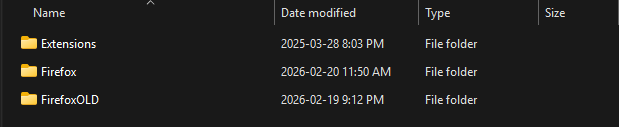 I then tried deleting the Firefox folder itself, and relaunching Firefox. This resulted in it being remade, but with just 2 folders left: Crash Reports and Pending Pings. Obviously that's not ideal, so I right clicked the Firefox folder and used the Windows "Previous versions" feature to restore the Firefox folder to a backup of how it was this morning. I then re-tried launching and I still got the same missing profiles error message. I also briefly attempted manually making a new profiles.ini file with notepad, and pointing it towards my Profile withing my Profiles folder, but that still resulted in the same missing profiles error.
